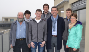 (von links) Edi und Elisabeth Gisler (Eltern); Beat Gisler, Geschäftsführer und -inhaber Adrian Föhn; Landammann Beat Jörg; Pius Betschart, Berufsbildner Föhn Platten AG; Yvonne Slongo, Amt für Berufsbildung.